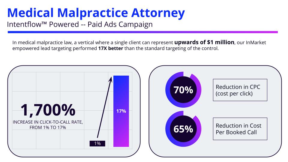 In medical malpractice law, a vertical where a single client can represent upwards of $1 million, our InMarket empowered lead targeting performed 17X better than the standard targeting of the control.