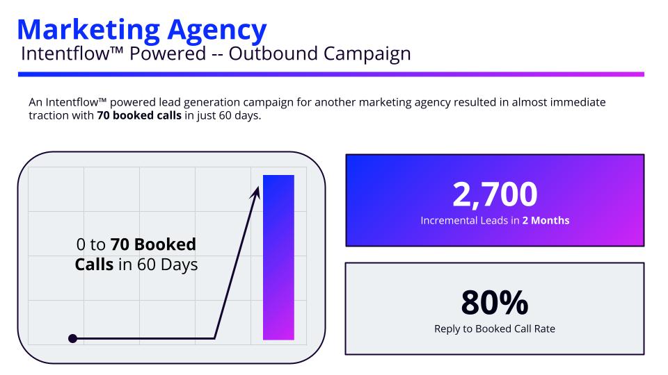 An Intentflow™ powered lead generation campaign for another marketing agency resulted in almost immediate traction with 70 booked calls in just 30 days, up from less than 1 per week on their own.