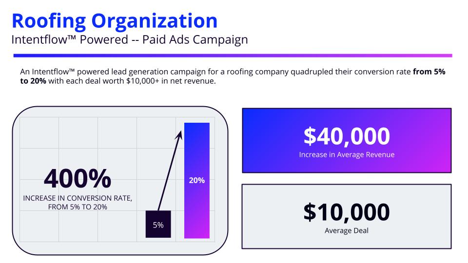 An Intentflow™ powered lead generation campaign for a roofing company quadrupled their conversion rate from 5% to 20% with each deal worth $10,000+ in net revenue.