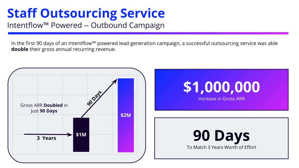 In the first 90 days of an Intentflow™ powered lead generation campaign, a successful outsourcing service was able double their gross annual recurring revenue. $1M ARR added in less than 90 days.