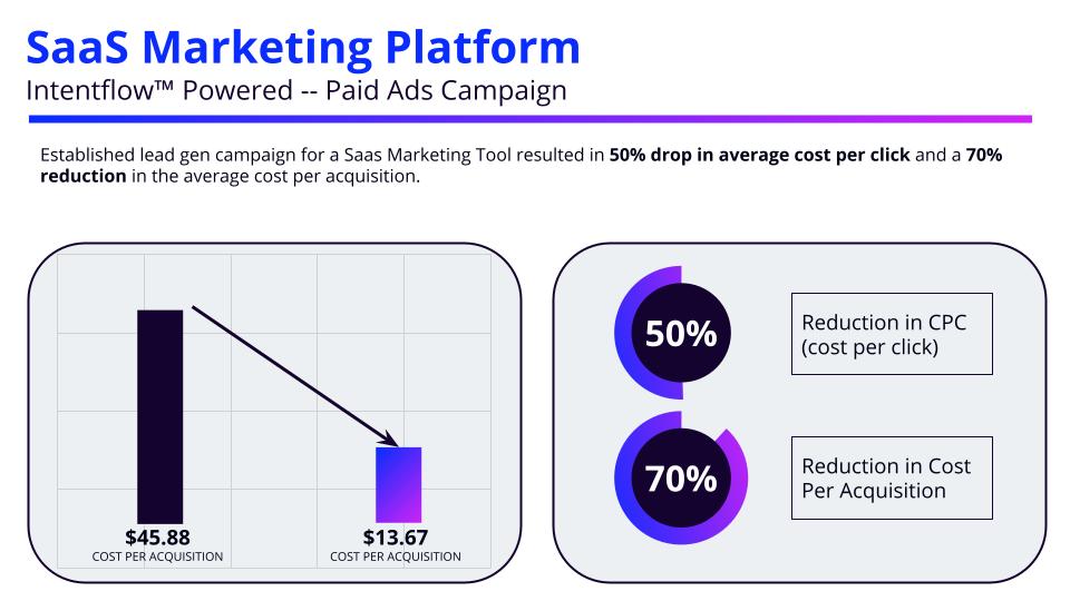 Established lead gen campaign for a Saas Marketing Tool resulted in 50% drop in average cost per click and a 70% reduction in the average cost per acquisition.