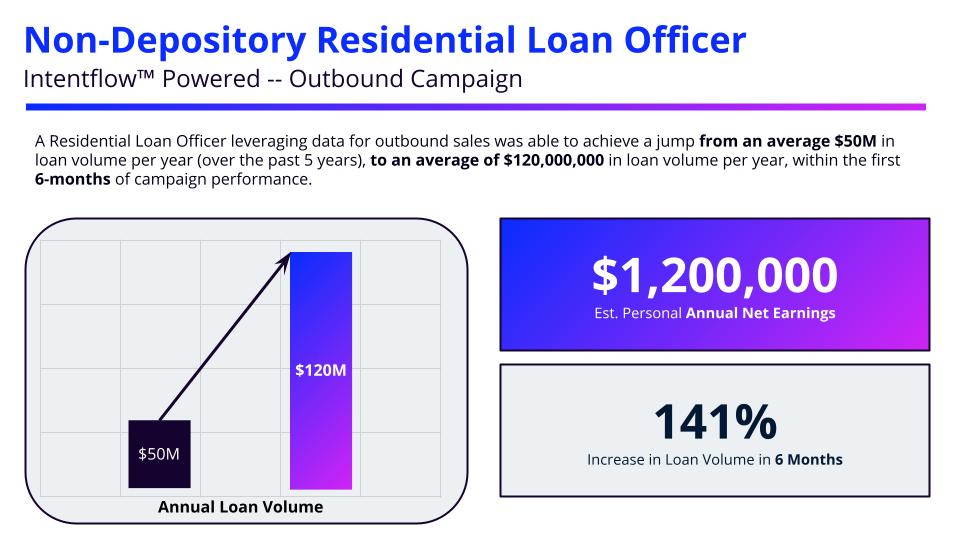 A Residential Loan Officer leveraging data for outbound sales was able to achieve a jump from an average $50M in loan volume per year (over the past 5 years), to an average of $120,000,000 in loan volume per year, within the first 6-months of campaign performance.