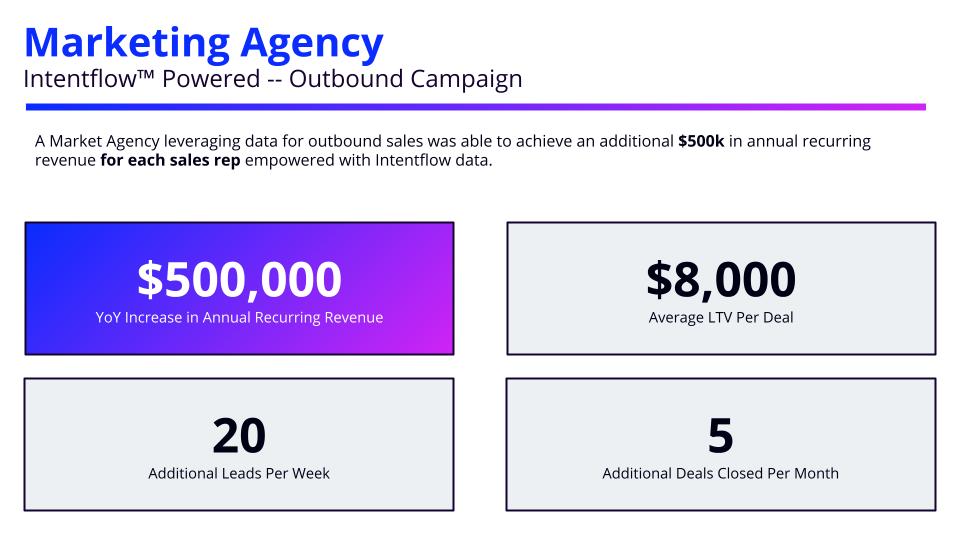 A Market Agency leveraging data for outbound sales was able to achieve an additional $500k in annual recurring revenue for each sales rep empowered with Intentflow data. Intent data dramatically outperformed the firmographic control.