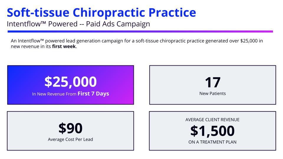 An Intentflow™ powered lead generation campaign for a soft-tissue chiropractic practice generated over $25,000 in new revenue in the very first week.