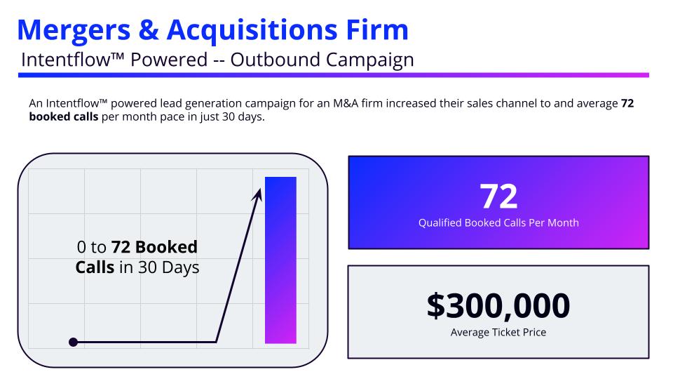 An Intentflow™ powered lead generation campaign for an M&A firm increased their sales channel to and average 72 booked calls per month pace in just 30 days. Their average annual value on a deal is around $300,000.