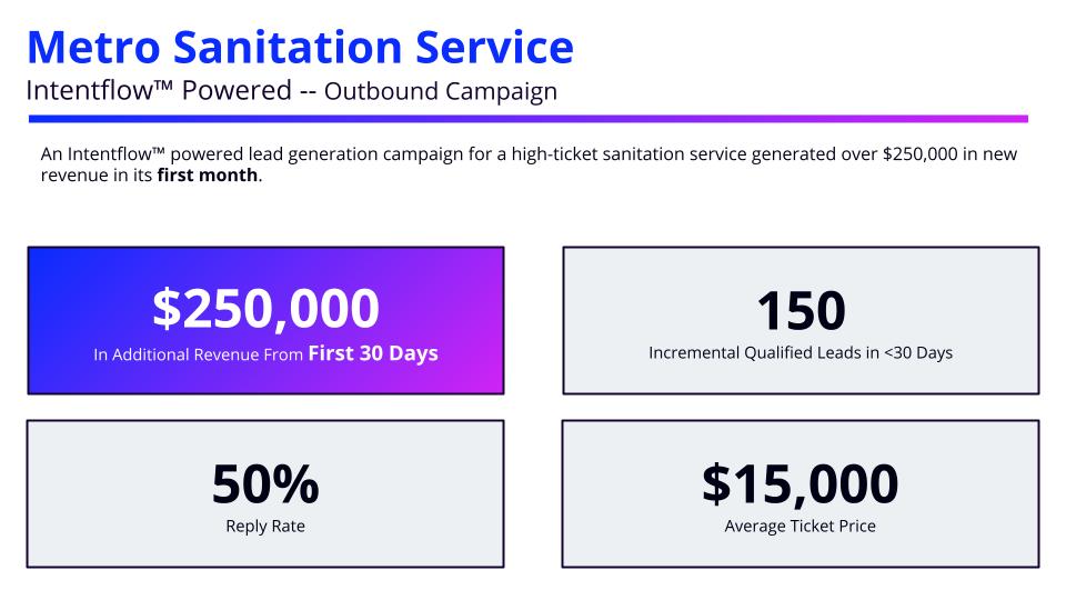 An Intentflow™ powered lead generation campaign for a high-ticket sanitation service generated over $250,000 in new revenue in its first month.