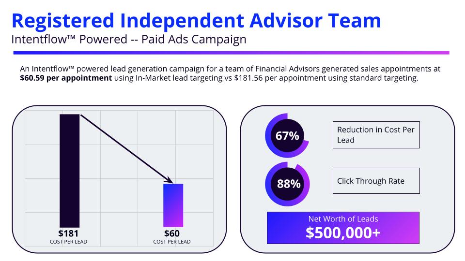 An Intentflow™ powered lead generation campaign for a team of Financial Advisors generated sales appointments at $60.59 per appointment using In-Market lead targeting vs $181.56 per appointment using standard targeting.