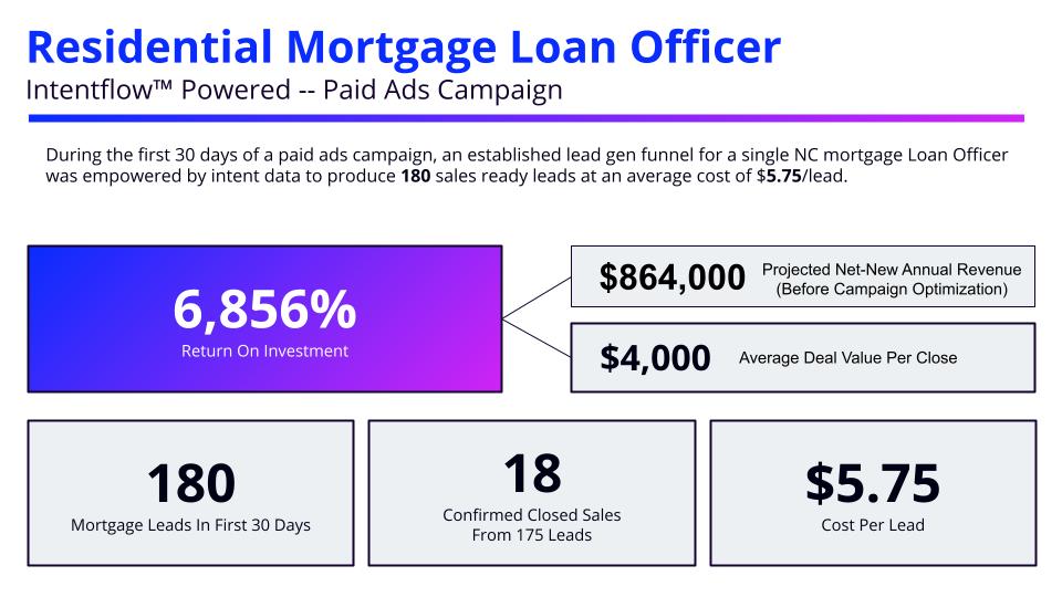 During the first 30 days of a paid ads campaign, an established lead gen funnel for a single NC mortgage Loan Officer was empowered by intent data to produce 180 sales ready leads at an average cost of $5.75/lead.